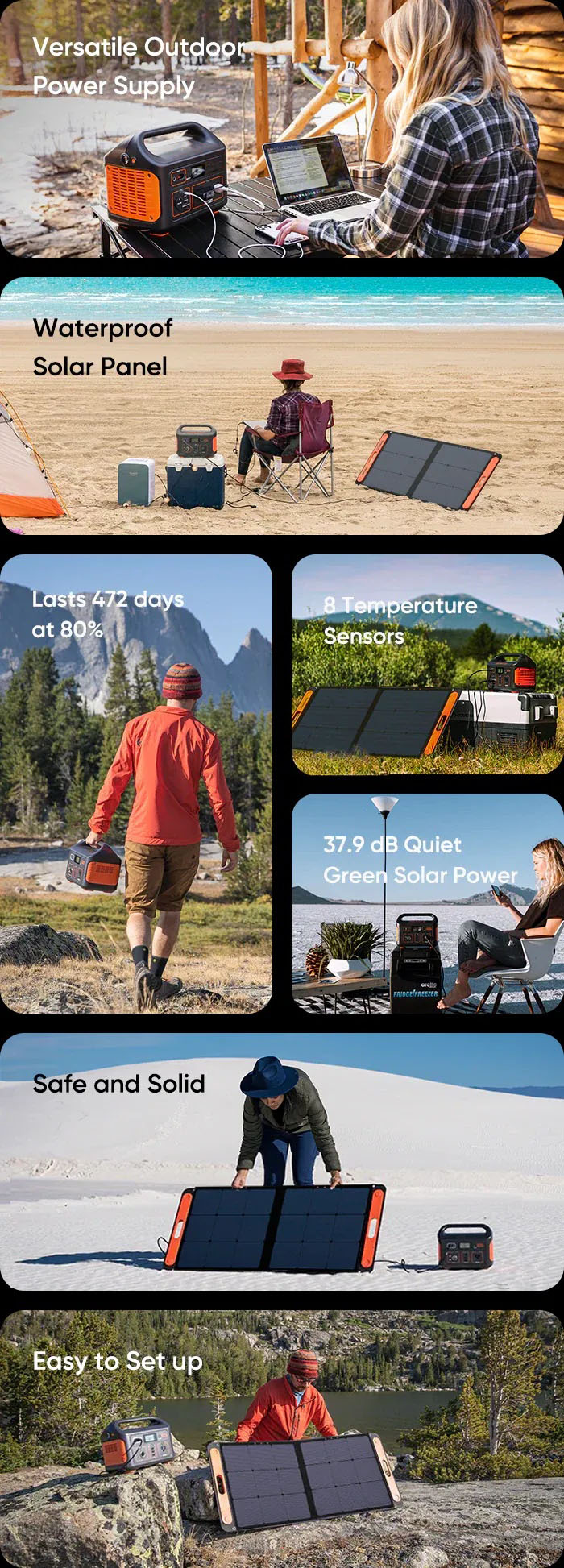 Emissions-free energy source and reliable battery management system make Explorer 500 safe even for indoor use. Made from durable material, the solar system is temperature resistant at high temperatures. The operating temperature range of the Explorer 500 power station is 14-104°F (-1040°C), and SolarSaga 100 is 14-149F (-10-65°C).