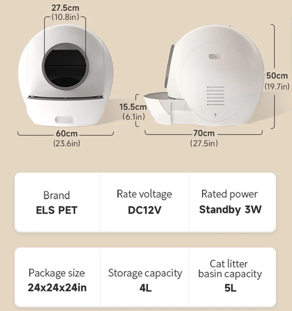 Accessories: Trash Box, Trash bag × 2 rolls, English Manual, Power Adapter*1,Cat litter scoop*1, Sponge plugs*2, Cleaning Brush*1, Smart shovel*2(The one not installed is a replacement).