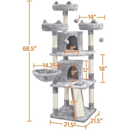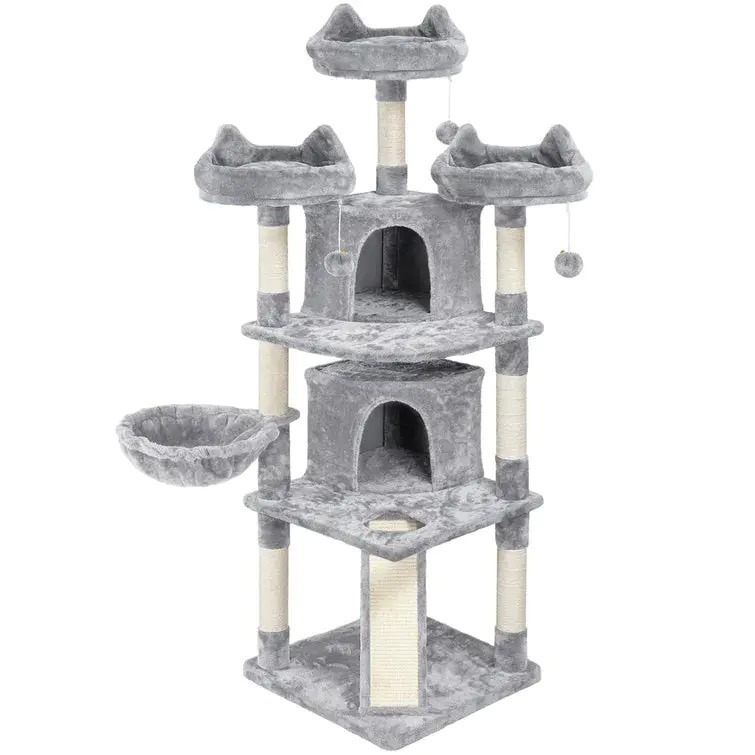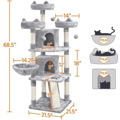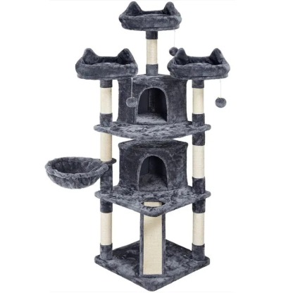 Multi-level: This large cat tree features multiple levels with 3 perches, 2 condos, 1 basket, 8 scratching posts, 1 scratching board, and 3 hanging balls. Multiple levels and layouts make this cat tree interesting and practical, enough for sleeping and playing.