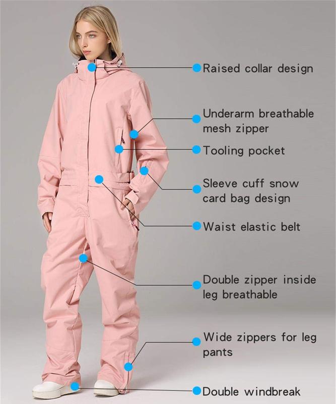 🎿 YEEFINE Ski Suits: One Piece JumpsuitDesign Features:·High raised windbreak collar to protect against the elements. ️·Adjustable cuffs for a snug fit.·Adjustable pants for comfort and flexibility.·Full waist zipper for easy toilet access.Additional Features:·Snow-out boots gaiter for extra protection.·Breathable zipper on the inside of the legs. ️·Top of the placket zipper has a shield to prevent clamping. ️·Snap and zipper at placket for double protection. ️Perfect for:·Women and men who need a waterproof and warm snowsuit. ️·Outdoor winter activities and athletic techwear. ️